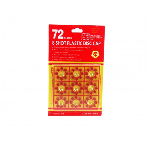 Kapiszony do pistoletów zabawkowych . W zestawie 9 krążków po 8 strzałów każdy, co razem daje nam 72 strzał z całego opakowania . Dyski pasują do wszelkich rewolwerów, pistoletów, karabinów z miejscem na amunicję 8 strzałową
